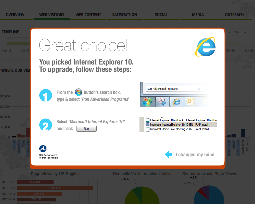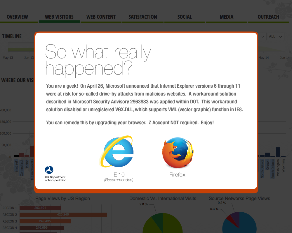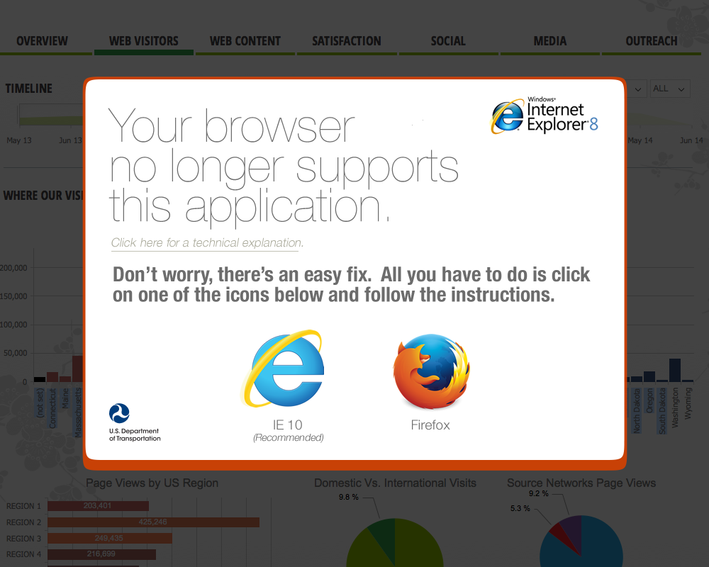 Due to a Microsoft security vulnerability affecting most versions of Internet explorer, we had to come up with a way to notify our users that some custom applications were no longer supported using their default IE8. The goal was to keep it as simple as possible and offer additional details for those who were interested.
