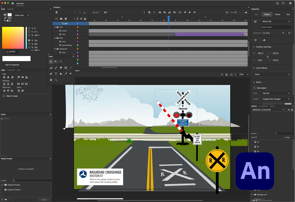 The Federal Railroad Administration launched a Railway Safety Campaign for Motorists and Pedestrians. I ended up using Adobe Animate to draw